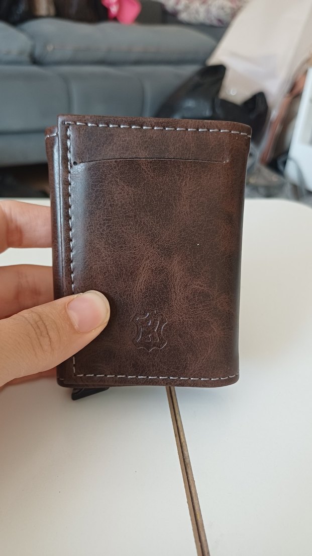 Koyu kahverengi deri, baskılı desen ve belirgin dikiş detaylarıyla erkek cüzdanı, minimalist ve hafif eski tarz sokak giyim stilinde.