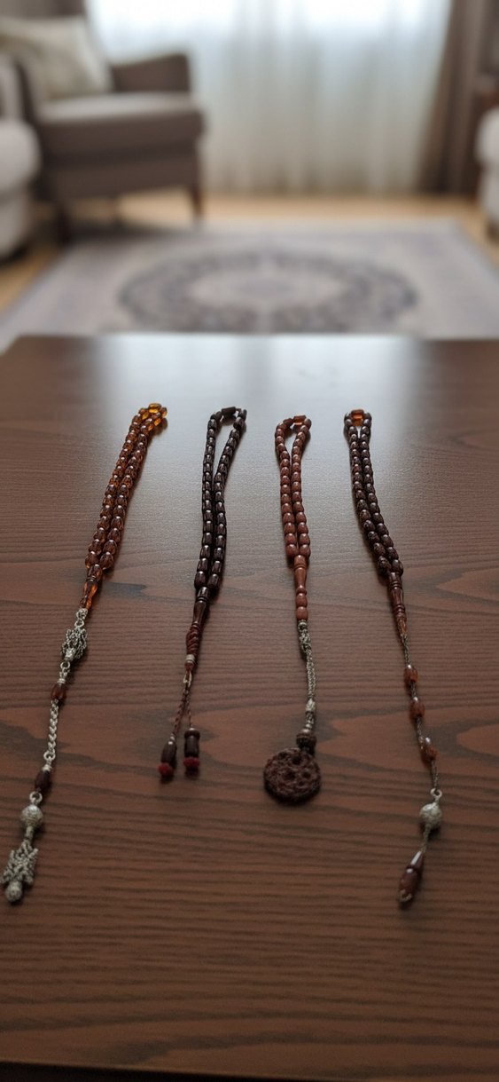 Koyu kahverengi tonlarda, minimalist ve detaylı gümüş aksanlı dört adet erkek tesbih seti.