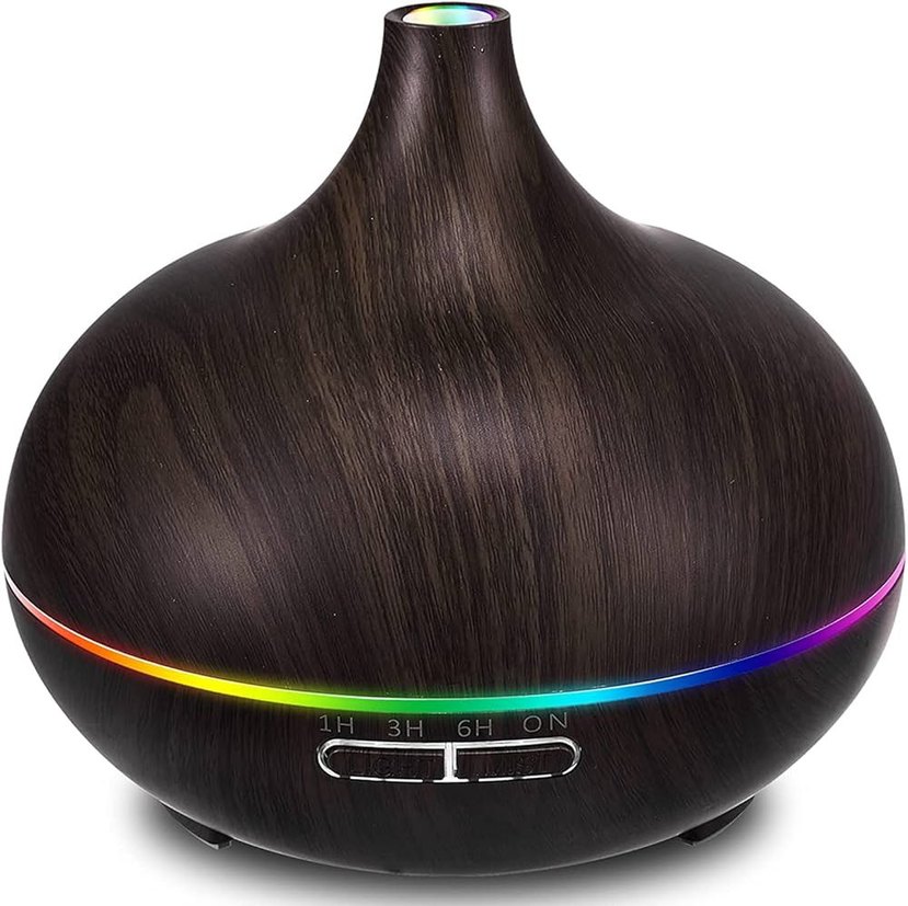 Koyu kahverengi, ahşap görünümlü hava temizleyici ve nemlendirici, çok renkli LED ışık ve 1, 3, 6 saat zaman ayarı ile.