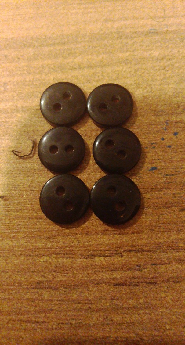 Altı adet koyu kahverengi, iki delikli, pürüzsüz malzemeden yapılmış düğme seti.