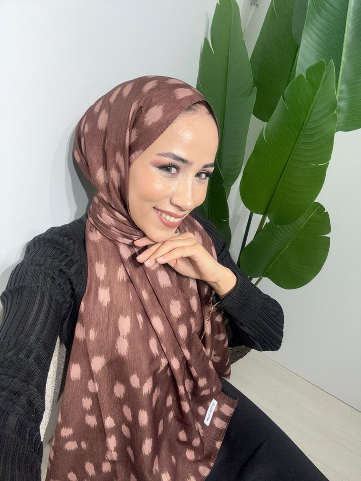 Koyu kahverengi, drapeli tasarıma sahip kadın şalı, yumuşak sentetik kumaştan üretilmiştir ve mütevazı, rahat sokak stili için uygundur.