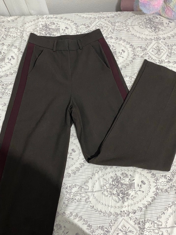 koyu kahverengi kumaş pantolon regular fit ve midi boyda. Sentetik kumaştan üretilmiş, ofis ve günlük iş stiline uygun.