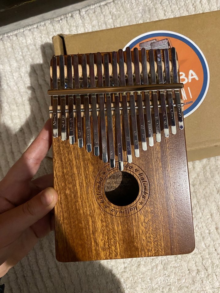 Koyu kahverengi ahşap gövde ve metal dilimlere sahip BA model kalimba, yuvarlak ses deliği ile dikkat çekiyor.