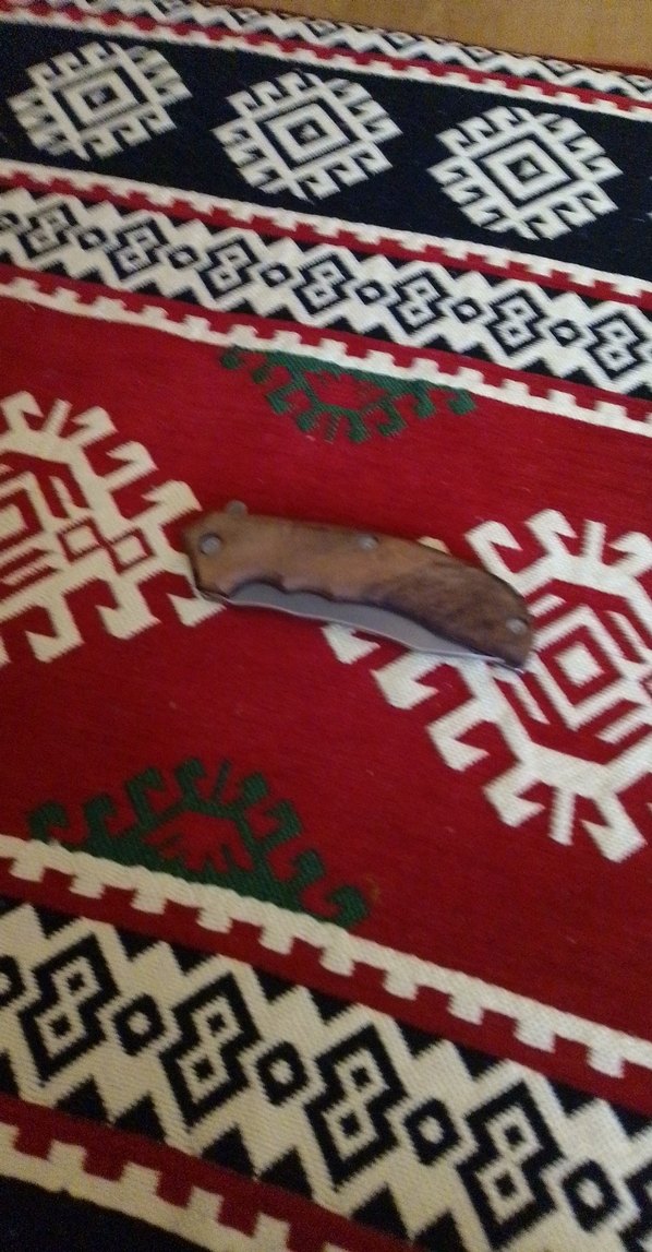 Koyu kahverengi katlanabilir çakı, kullanışlı taşınabilir tasarıma sahip ahşap saplıdır. Günlük kullanım için uygundur.