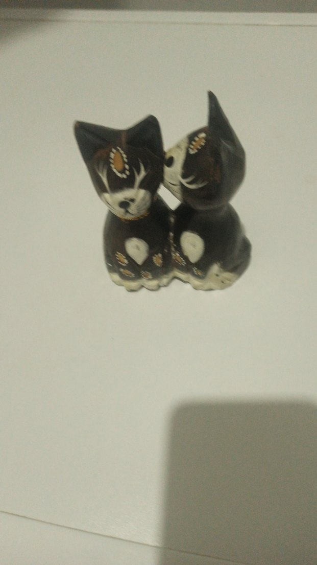Koyu kahverengi renkte, birbirine yakın oturan iki kediyi betimleyen, yüz ve vücut detayları özenle boyanmış bir figürin.