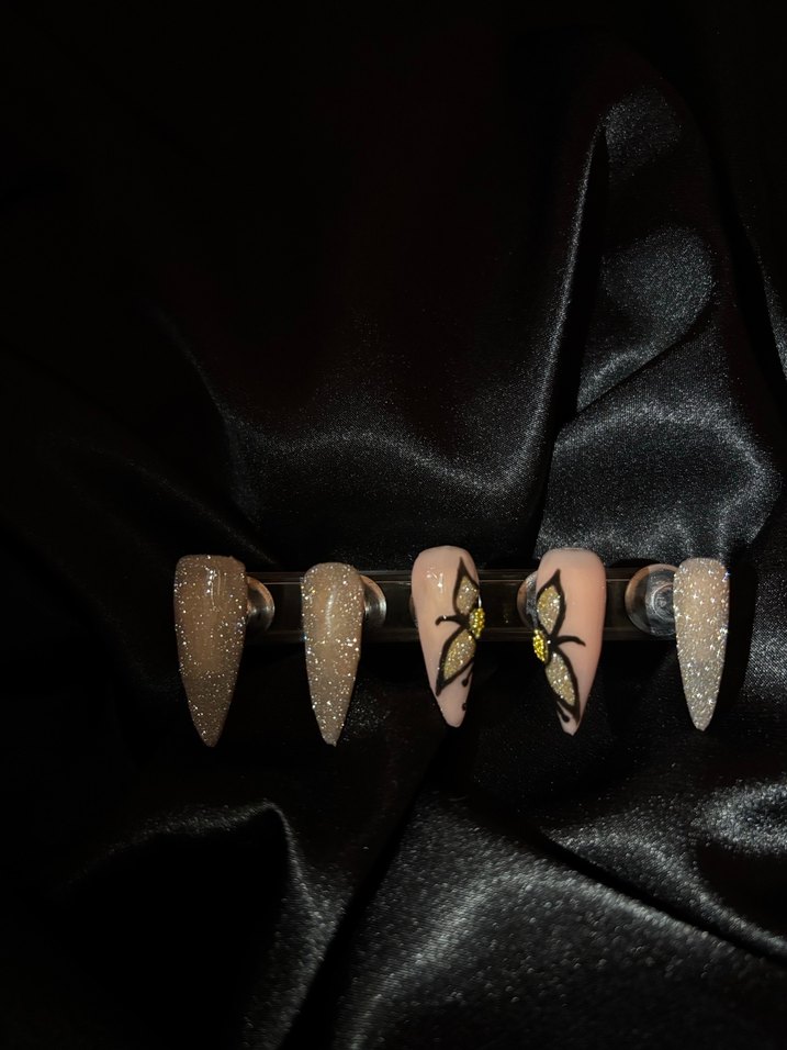 Simli ve kelebek desenli koyu kahverengi tırnak süslemeleri, tırnaklara şık bir görünüm kazandırır. Yeni nesil tips üzerine jel uygulanarak kalıcı oje ile renklendirilmiştir. Ölçülerinize özel olarak hazırlanacaktır. Paket içerisinde portakal çubuğu ve mini törpü mevcuttur. Yeni ilan açtırınız