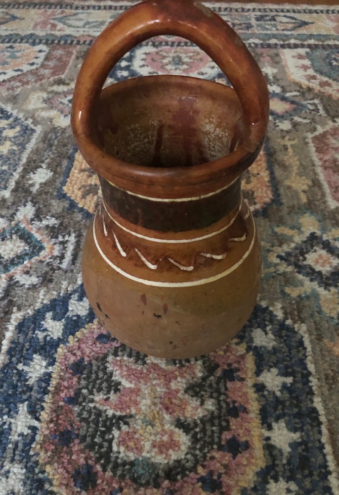 Koyu kahverengi seramik vazo, sağlam kulpu ve boyun kısmında dekoratif desenleriyle rustik bir görünüme sahiptir. Antika güğüm alt kısmında ufak bi deliği var zararsız.