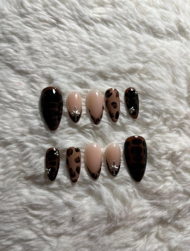 Parlak yüzeye sahip koyu kahverengi leopar desenli tırnak süsleri, şık bir görünüm için hafif süslemeler içerir.