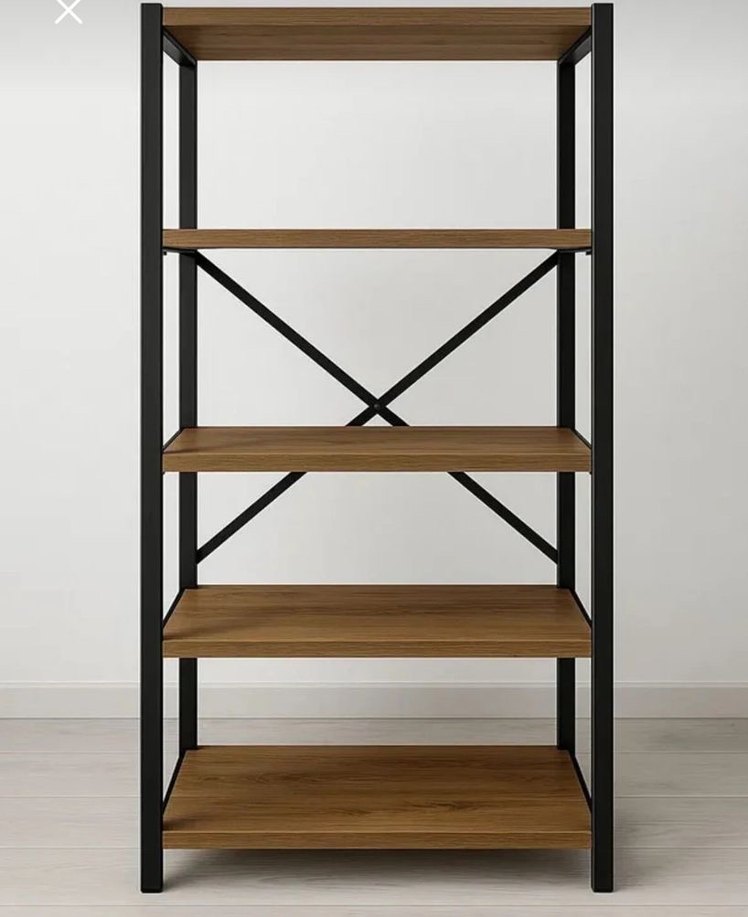 Koyu kahverengi ahşap raflar ve siyah metal çerçeve, dolabınızı veya odanızı düzenlemek için sağlam ve geniş depolama alanı sağlar. Ürün sıfırdır