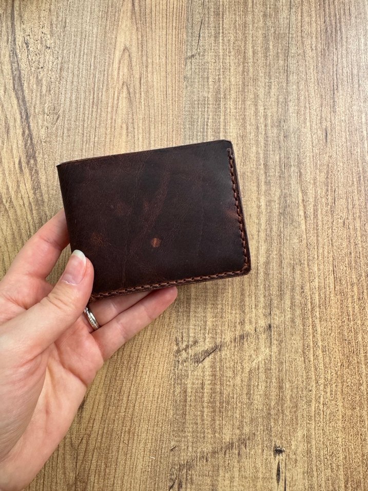 Koyu kahverengi, desen içermeyen minimalist bohem tarzda erkek cüzdanı. Klasik ve sade tasarımıyla günlük kullanıma uygundur. Hediye geldi sanırım gerçek deri Hiç kullanmadım defosu yok temizdir