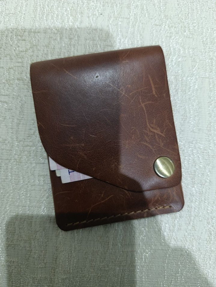 Koyu kahverengi, minimal desenli erkek cüzdanı, metal düğmeli kapama ile eski ve kullanılmış görünüme sahip.