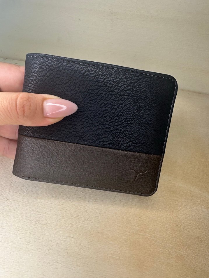 Koyu kahverengi ve siyah tonlarda, desen içermeyen minimalist tasarımlı erkek cüzdanı. Dayanıklı malzemeden üretilmiştir, street wear stiline uygundur.
