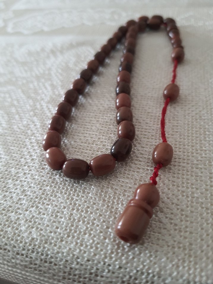 Koyu kahverengi boncuklardan oluşan erkek tesbih, kırmızı ip üzerinde sade ve geleneksel bir tasarıma sahiptir.