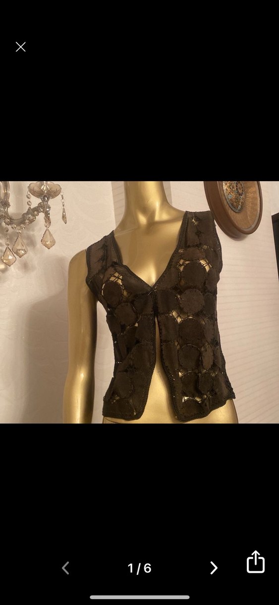 Koyu kahverengi deri mini yelek, nakışlı ve boncuk detaylı. V yaka ve kolsuz, vücuda oturan kesimiyle dikkat çekiyor. Nostaljik süet yelek haki renk iki koltuk altı arası 41 cm boy.53 cm