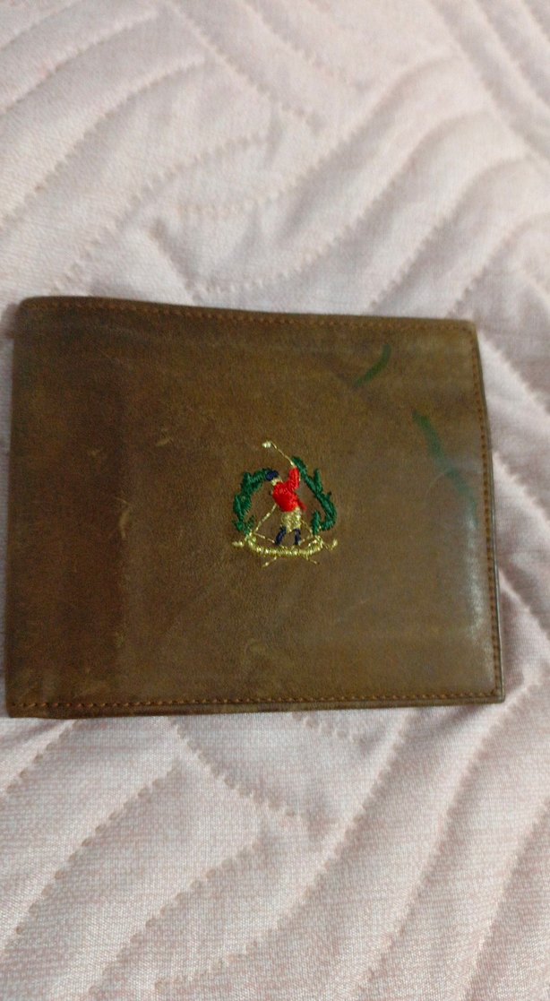 Ortada nakışlı detay bulunan koyu kahverengi erkek cüzdan. Deride doğal kullanım izleri var, vintage tarzda.