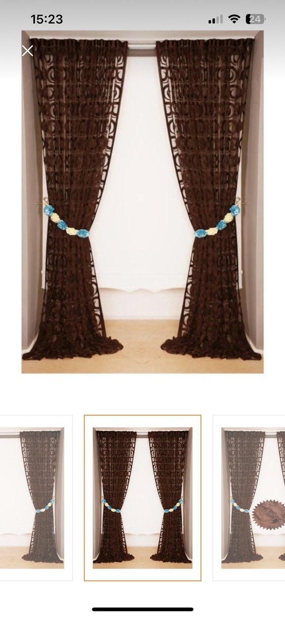 Koyu kahverengi, nakışlı desenlere sahip modern tarzda perde. Dokulu kumaşı ve süslemeleriyle şık bir pencere örtüsü sunar. Eni 280 boyu 270 dir.yıkama torbasıyla bırlıkte gelır.