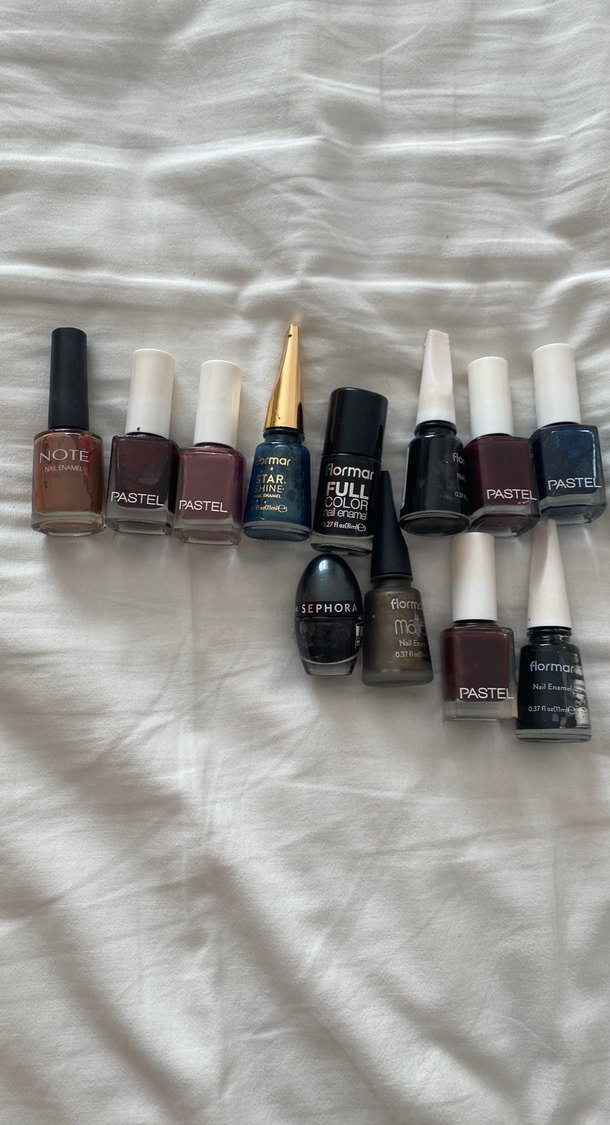 HEPSİ BİRARADA Pastel, Sephora, Note ve Flormar markalarından koyu kahverengi tonlarında çeşitli ojeler içeren set. Farklı renk ve bitişler bulunur.