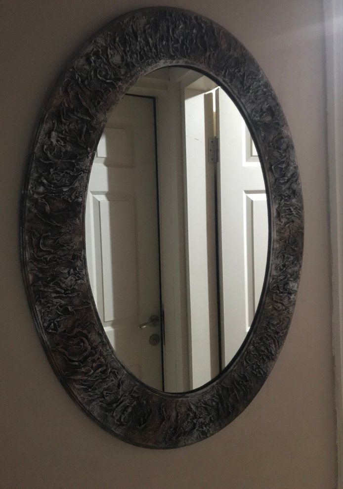 Dokulu detaylara sahip koyu kahverengi dekoratif oval ayna, her odaya karakter katıyor . Tasarım ayna el yapımıdır , bakır ve gümüş tonlarında.