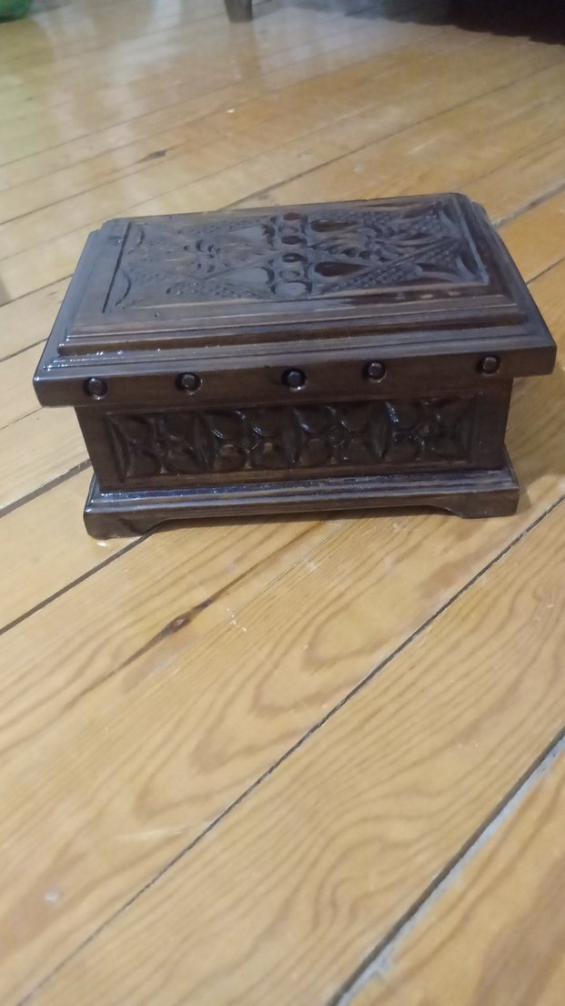 Koyu kahverengi, kapağı ve yanları oyma detaylı ahşap kutu. çam ağacından yapılmıştır.