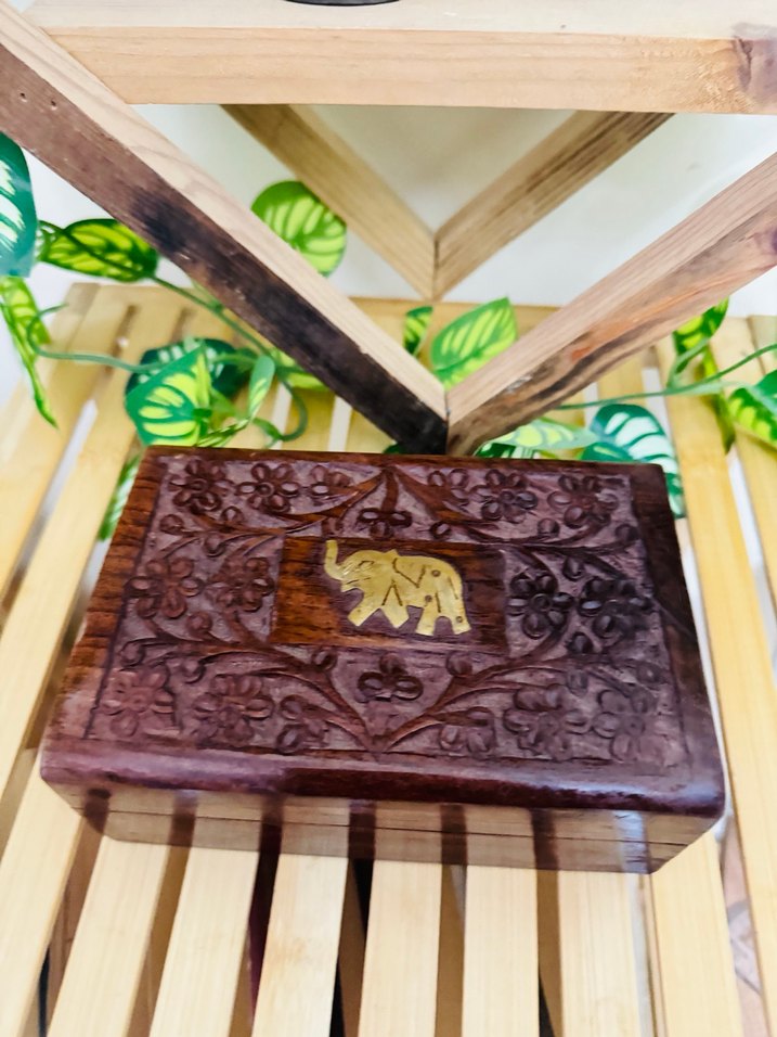 Koyu kahverengi ahşaptan yapılmış, ortasında fil motifi ve detaylı çiçek oyma desenleri bulunan oyuncak kutusu.