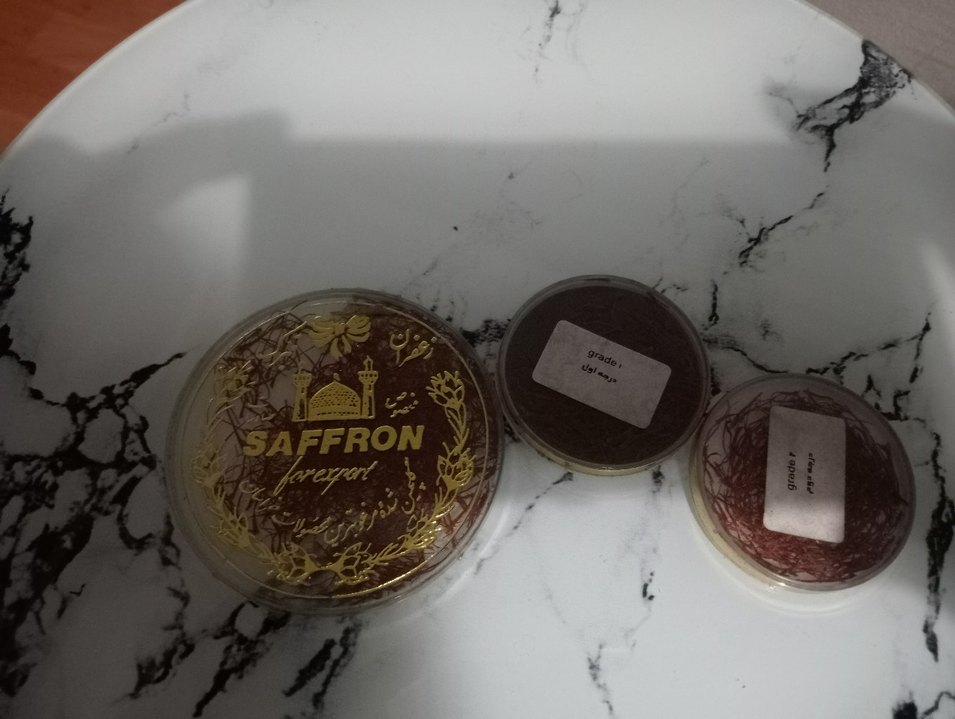 Koyu kahverengi safran tozu, yuvarlak kapta altın renkli yazı ve desenlerle etiketlenmiş.