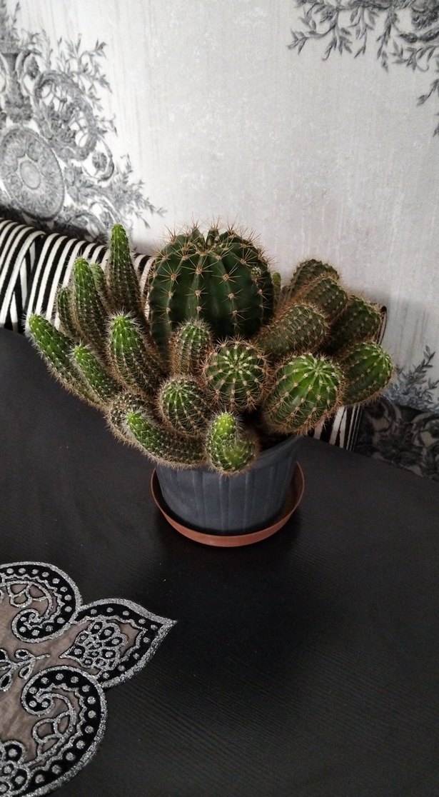 Koyu kahverengi saksıda çoklu dallı canlı yeşil kaktüs, doğal ve dikkat çekici bir ev dekorasyonu sağlar.