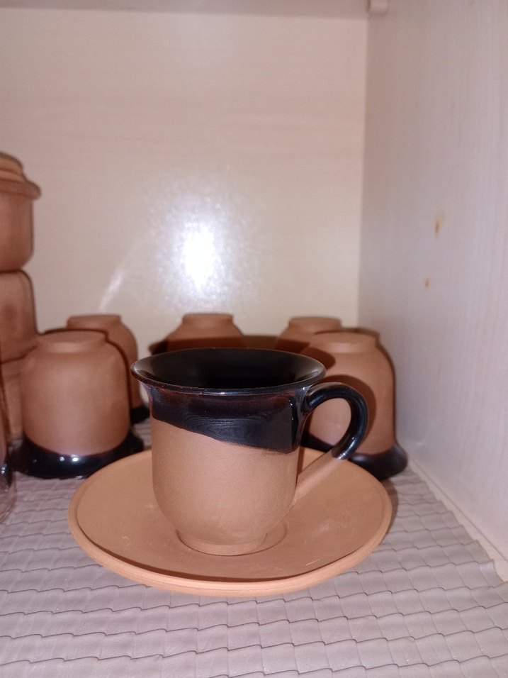 Koyu kahverengi seramik fincan ve tabağı, pürüzsüz yüzeyi ve sade tasarımıyla sıcak içecekler için uygundur. ☕