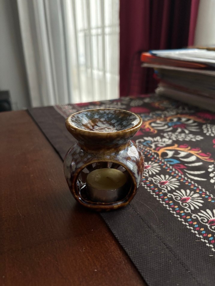 Koyu kahverengi seramik mumluk, tealight mum için alt bölümde boşluk ve üstte esans yağı veya mum eritme platformu içerir. ️