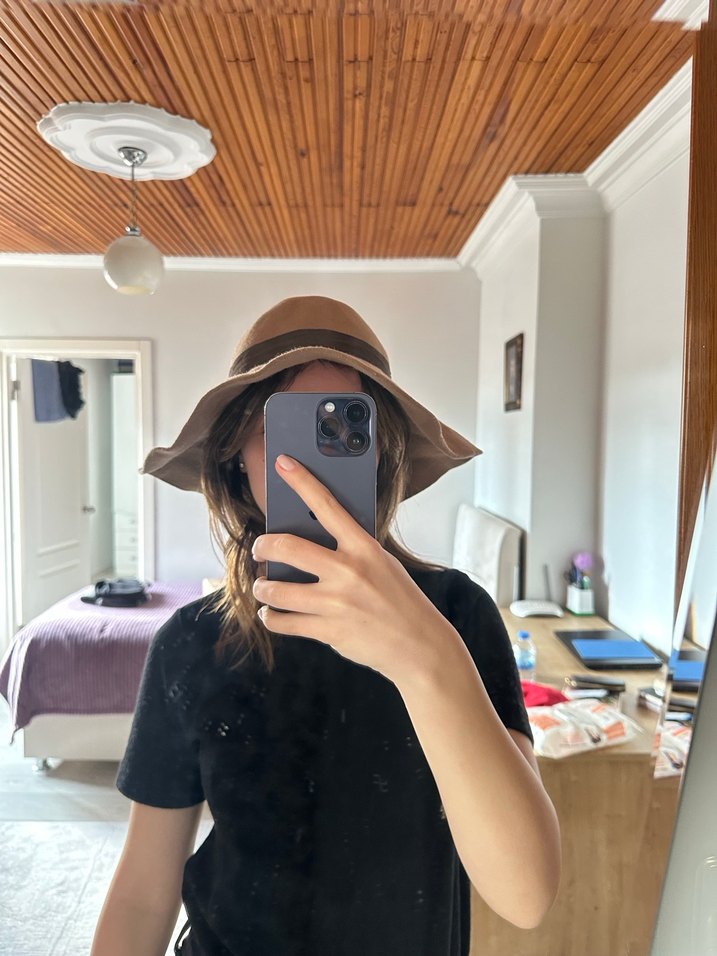 Sentetik kumaştan yapılmış, koyu kahverengi detaylı sütlü kahverengi kadın şapkası, bohem ve retro sokak giyimi tarzını yansıtıyor.