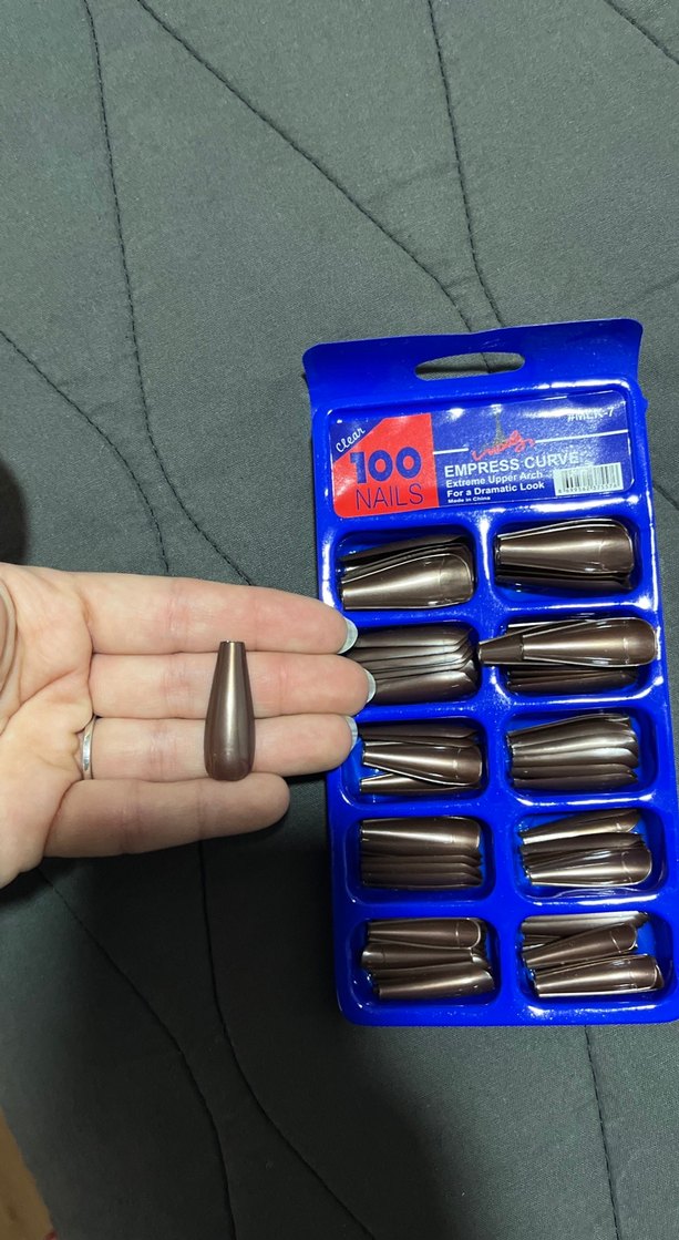 100 adet koyu kahverengi, kavisli tasarıma sahip takma tırnak seti. Hızlı ve etkili tırnak süsleme için uygundur.