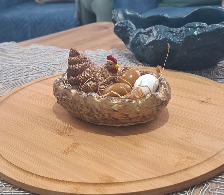 Koyu kahverengi tavuk figürü, yumurtalarla dolu bir yuva içinde detaylı dokusuyla rustik bir görünüm sunar. taş tozundan yapılmıştır.