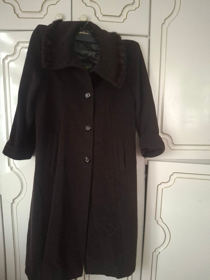 Düğmeli kapamalı, yumuşak yakalı uzun koyu kahverengi kaban. l ve xl için uygun