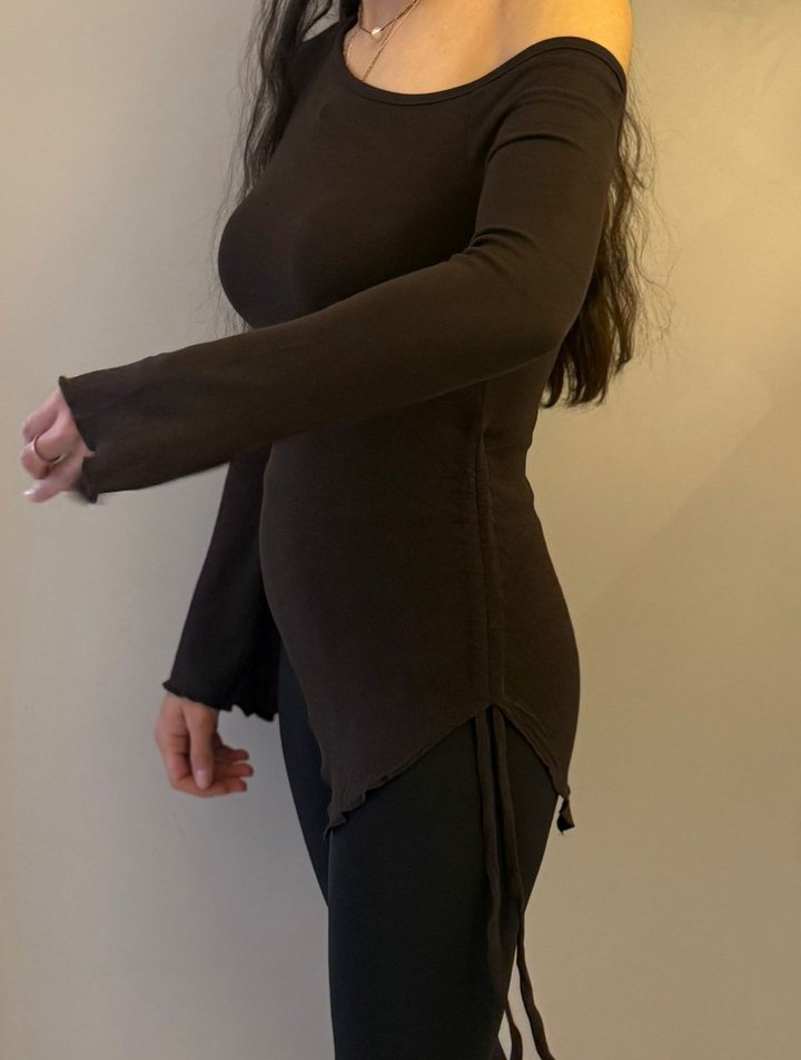 Koyu Kahverengi Uzun Kollu Bluz yandan büzgülü