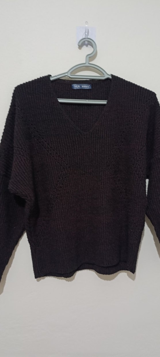 Koyu kahverengi, V yakalı uzun kollu örgü kazak, bol kesim ve rahat goth tarzıyla günlük kullanıma uygundur.