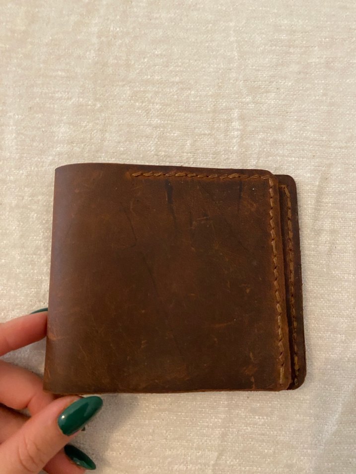 Koyu kahverengi, desen içermeyen vintage tarzda cüzdan. Klasik ve sade bir tasarıma sahiptir. Ablam venedikten getirdi. El yapımı özel gerçek deridir. Başka çeşitleri de var. Evde fazlalık yapmasın diye satıyorum.