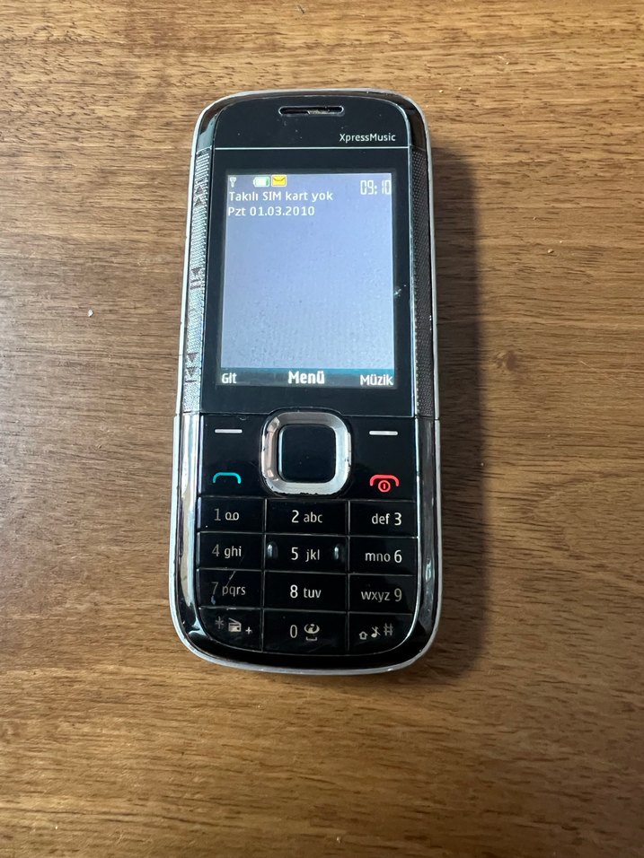 Koyu kahverengi XpressMusic telefon, rakam ve harf içeren tuş takımı ile küçük ekran sunar. Ortada yön tuşu ve çağrı kontrol tuşları bulunur.