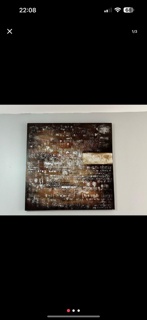 Koyu kahverengi tonlarda, dokulu ve soluk yazı öğeleriyle soyut bir etki yaratan dekoratif tablo. Sıfır büyük ölçü