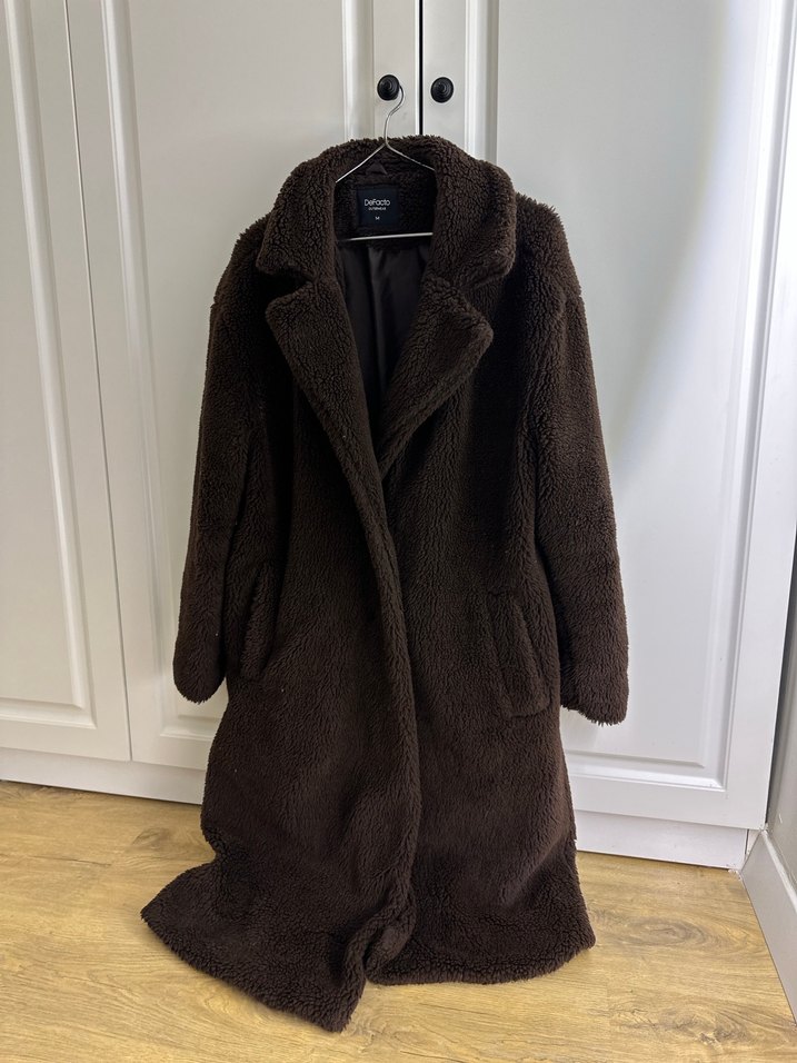 Koyu kahverengi, yumuşak dokulu uzun kaban. Geniş yaka ve yan ceplerle rahat kullanım sunar. İç kısmı astarlıdır. Çok az giydim hiçbir sorunu yok. M beden defacto.