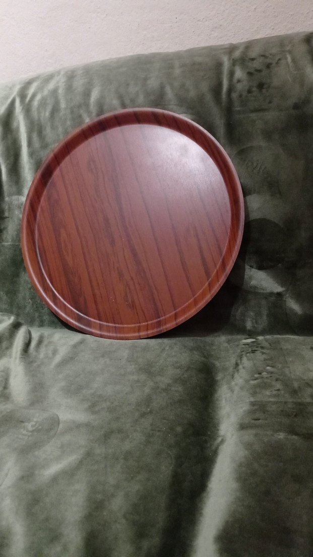 Koyu kahverengi, desen içermeyen yuvarlak ahşap tepsi, servis veya sunum için uygundur.
