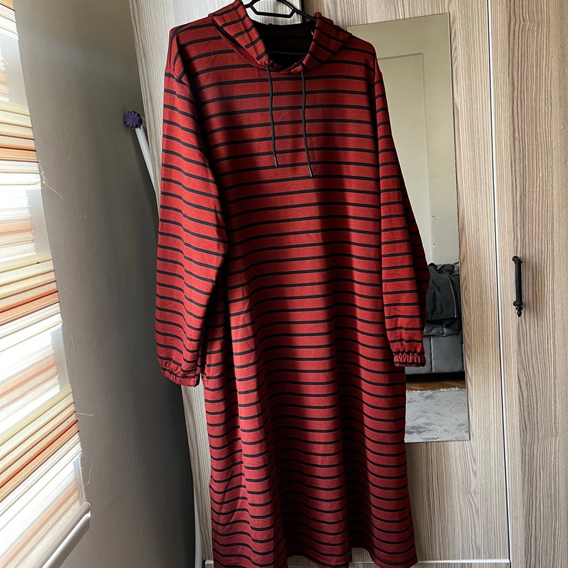 Uzun, bol kesim triko elbise, uzun kollu ve yüksek yakalıdır, kapüşonlu drapeli tasarıma sahiptir. Koyu kiremit rengi ve siyah çizgili, günlük rahat kullanıma uygundur. Yeni giyilmedi