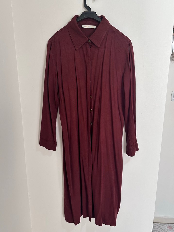 Koyu kiremit renkli, uzun kollu ve düğmeli hamile tunik. Yumuşak keten kumaştan, bol kesim ve yakalı. Minimalist, çağdaş tarzda, ofis için uygun.