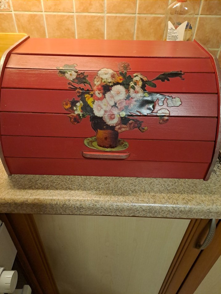 Önünde çiçek desenli, koyu kırmızı ahşap ekmek organizeri. Üstte açılır kapak bulunur.