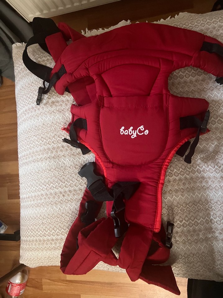 Koyu kırmızı babyCo bebek taşıyıcı, rahat taşıma için yastıklı destek ve güvenli kayışlar sunar. Ayarlanabilir yapısı sayesinde bebeğe ve ebeveyne uyum sağlar.