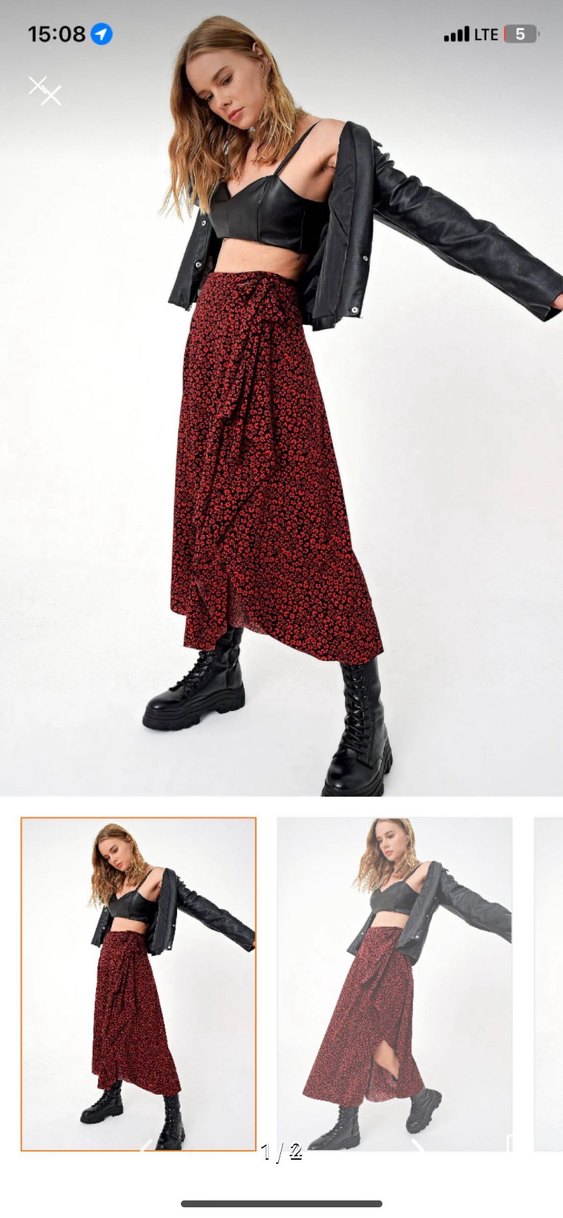 Koyu kırmızı renkli, bağlamalı ve salaş kesimli midi etek. Sentetik kumaştan, bağlamalı ve batik desenlidir.