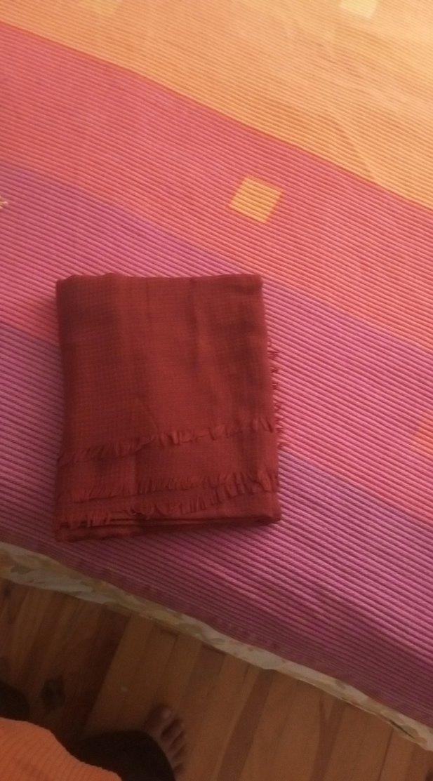 Koyu kırmızı renkte, sade ve püsküllü kenar detaylı, yumuşak ve rahat bir kumaştan yapılmış sal. Geleneksel ve basic stil için uygun.