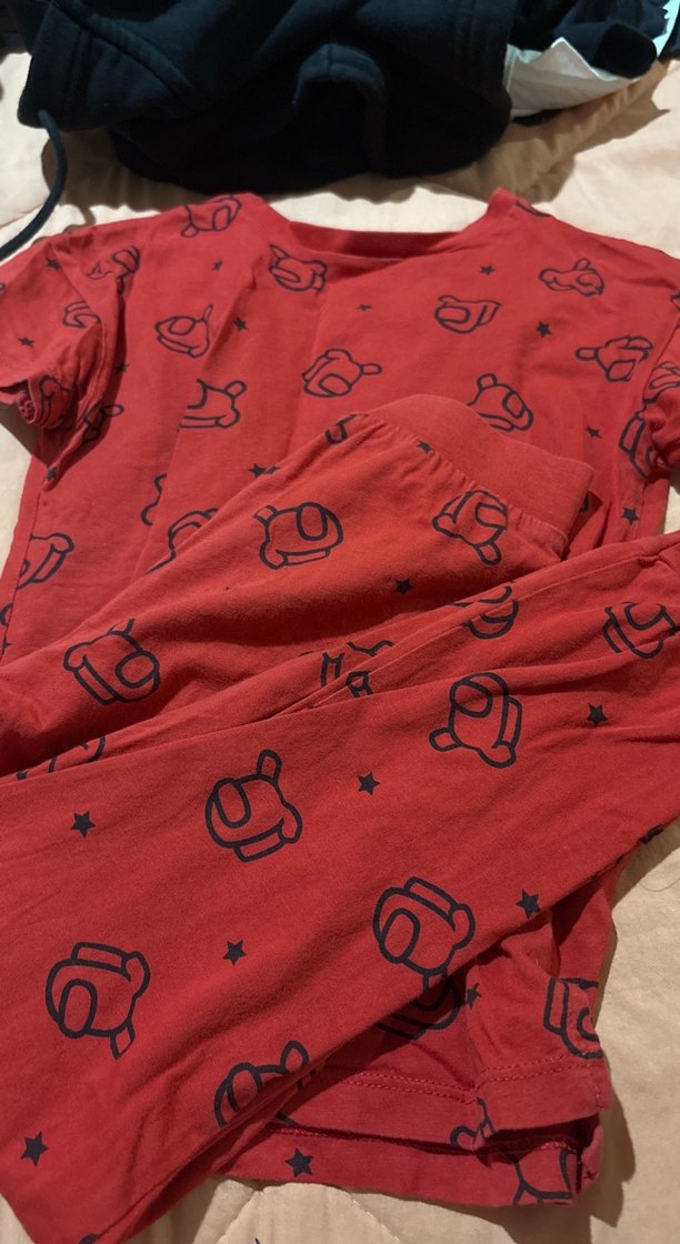 Koyu kırmızı renkte, baskılı desenlere sahip, düğmeli detaylı, uzun kollu ve bisiklet yaka erkek pijama takımı. Rahat ve trend görünümlü.