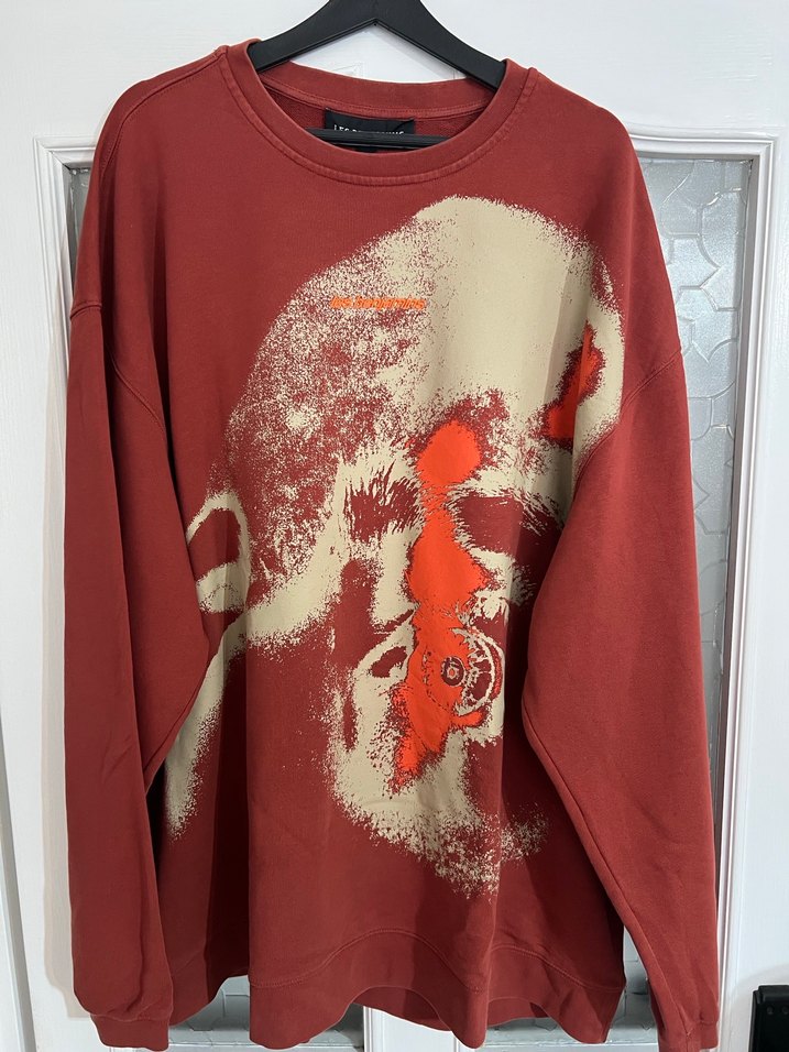 Koyu kırmızı renkli, uzun kollu, yuvarlak yakalı ve bol kesim erkek sweatshirtü. Baskılı soyut tasarıma sahip, yumuşak ve sıcak kumaştan üretilmiş, günlük kullanım için uygun.