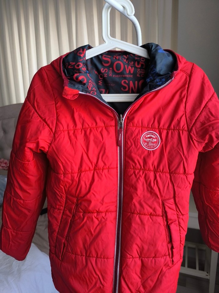 Koyu kırmızı baskılı, fermuarlı, yüksek yakalı erkek mont. Sentetik kumaştan üretilmiş, sokak stili için uygun, içi parlak kırmızı astarlı.