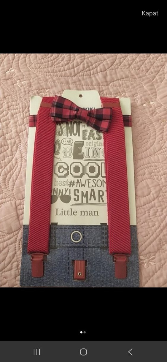 Koyu kırmızı kot kumaştan yapılmış, baskılı bohem tarzda çocuk askısı. Kemer tokalı ve ekli ekose papyonla şık bir görünüm sağlar.
