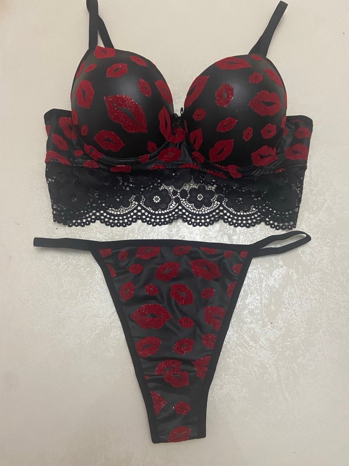 Koyu kırmızı dudak baskılı gotik stil sütyen ve mini külot takımı, sütyenin dantelli detayları ile tamamlanmıştır. Bedenleri mevcuttur sorabilirsiniz 80/85/90/95 deri görünümlüdür